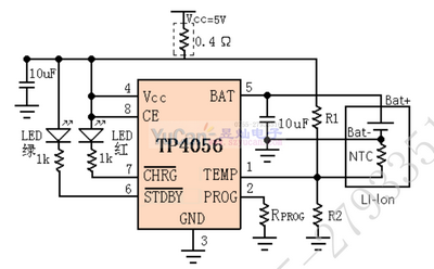 當(dāng)輸入電壓(交流適配器或USB電源)被拿掉時(shí),TP4056自動(dòng)進(jìn)入一個(gè)低電流狀態(tài),將電池漏電流降至2uA以下.TP4056在有電源時(shí)也可置于停機(jī)模式,以而將供電電流降至55uA.TP4056的其他特點(diǎn)包括電池溫度檢測(cè)、欠壓閉鎖、自動(dòng)再充電和兩個(gè)用于指示充電、結(jié)束的LED狀態(tài)引腳